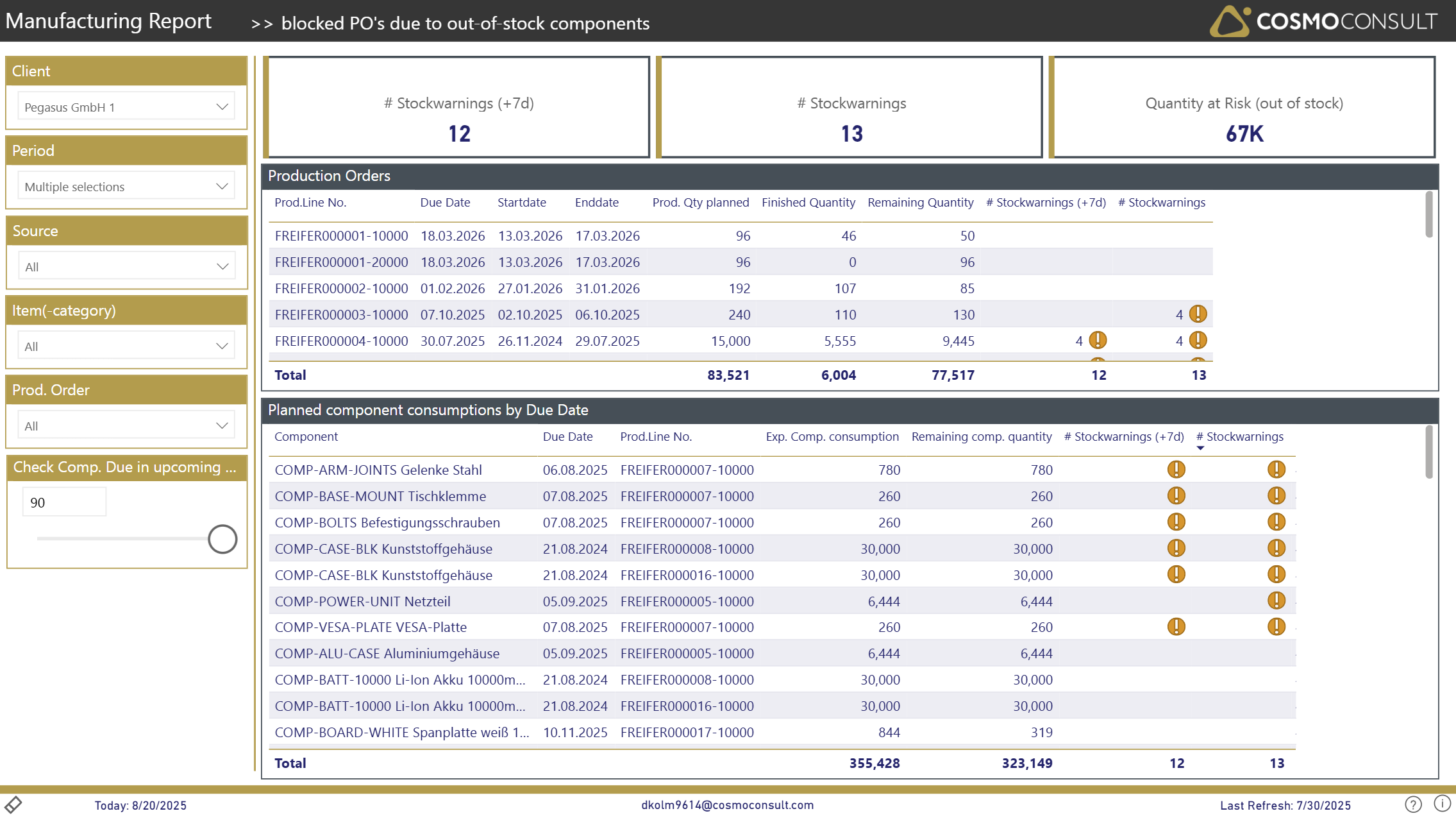 - # Stockwarnings: some components might have longer reorder-times. using the parameter "Check Comp. Due in upcoming days" in the left slicer section, you can parameterize the timeperiod when components might be checked.