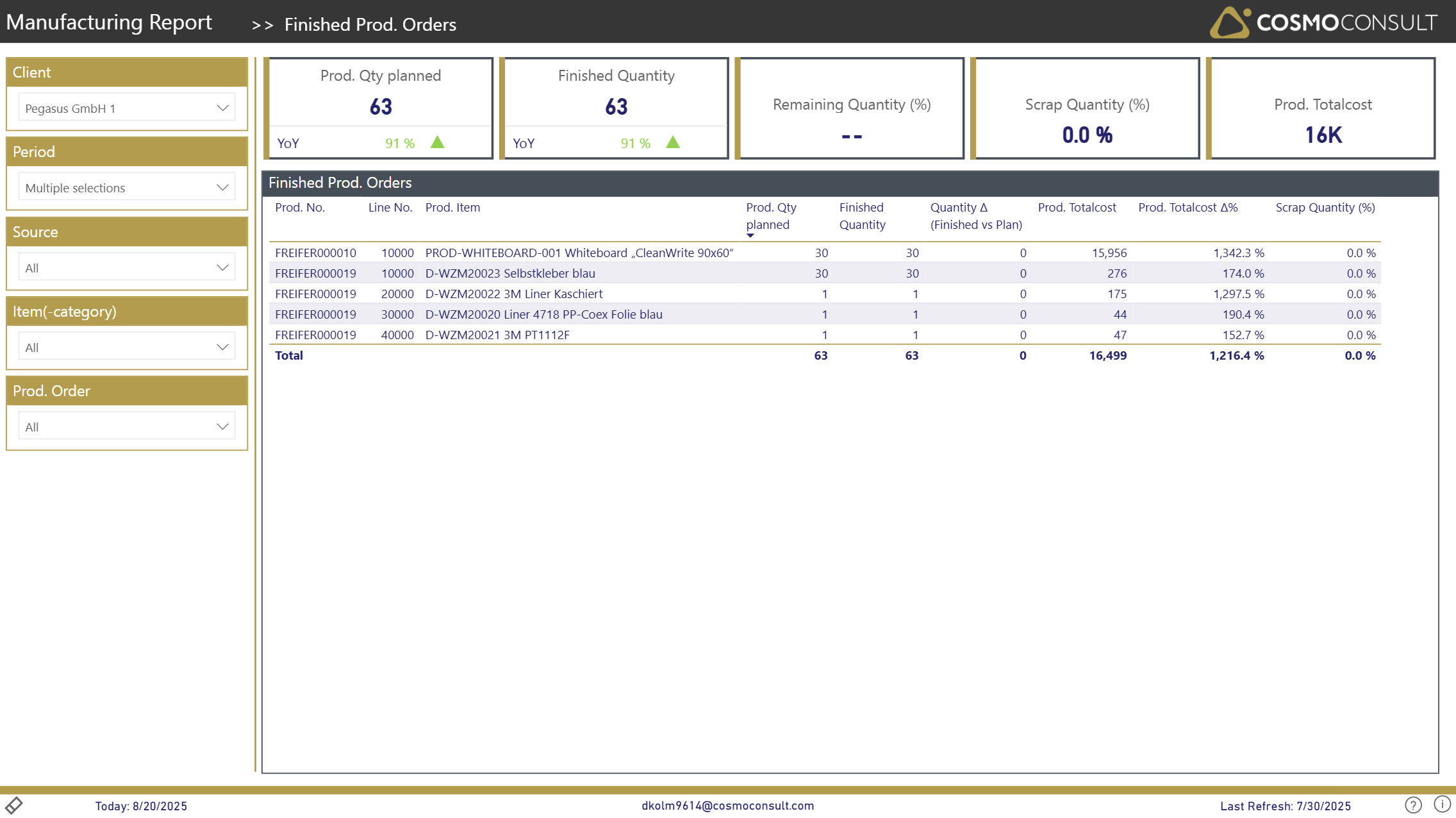 Finished Production Orders ... provides a brief overview of all finsihed production orders with relevant KPIs like quantity deviations, cost deviations and scrap.