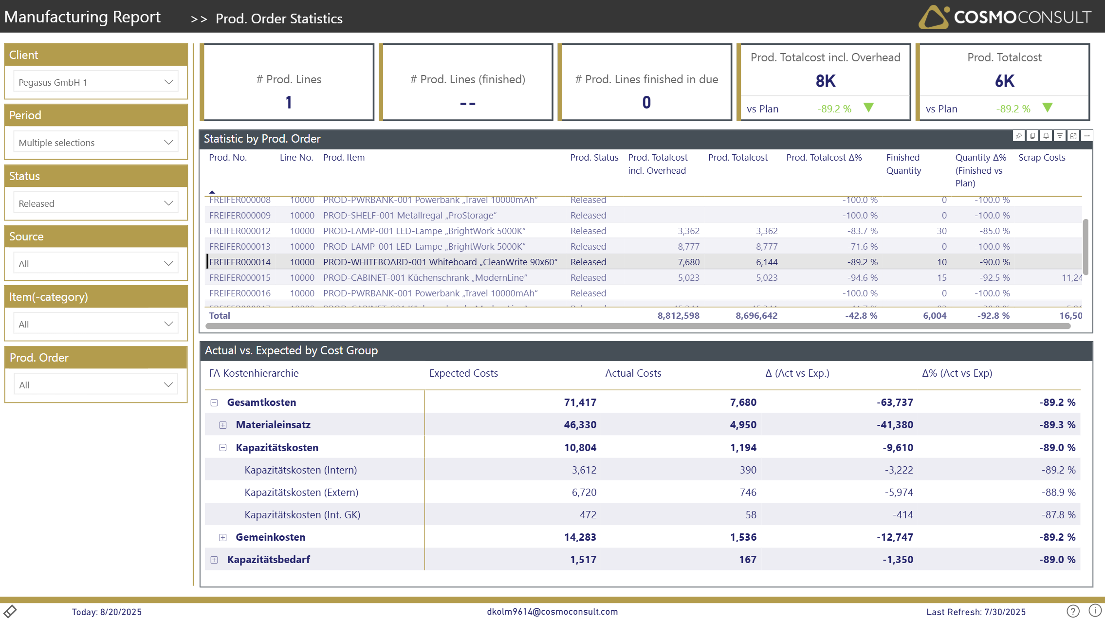 The table in the upper area can be used to sort prod. orders based on measures like total costs, deviations or scrap costs and can be used as interactive filter for the cost-group matrix below.