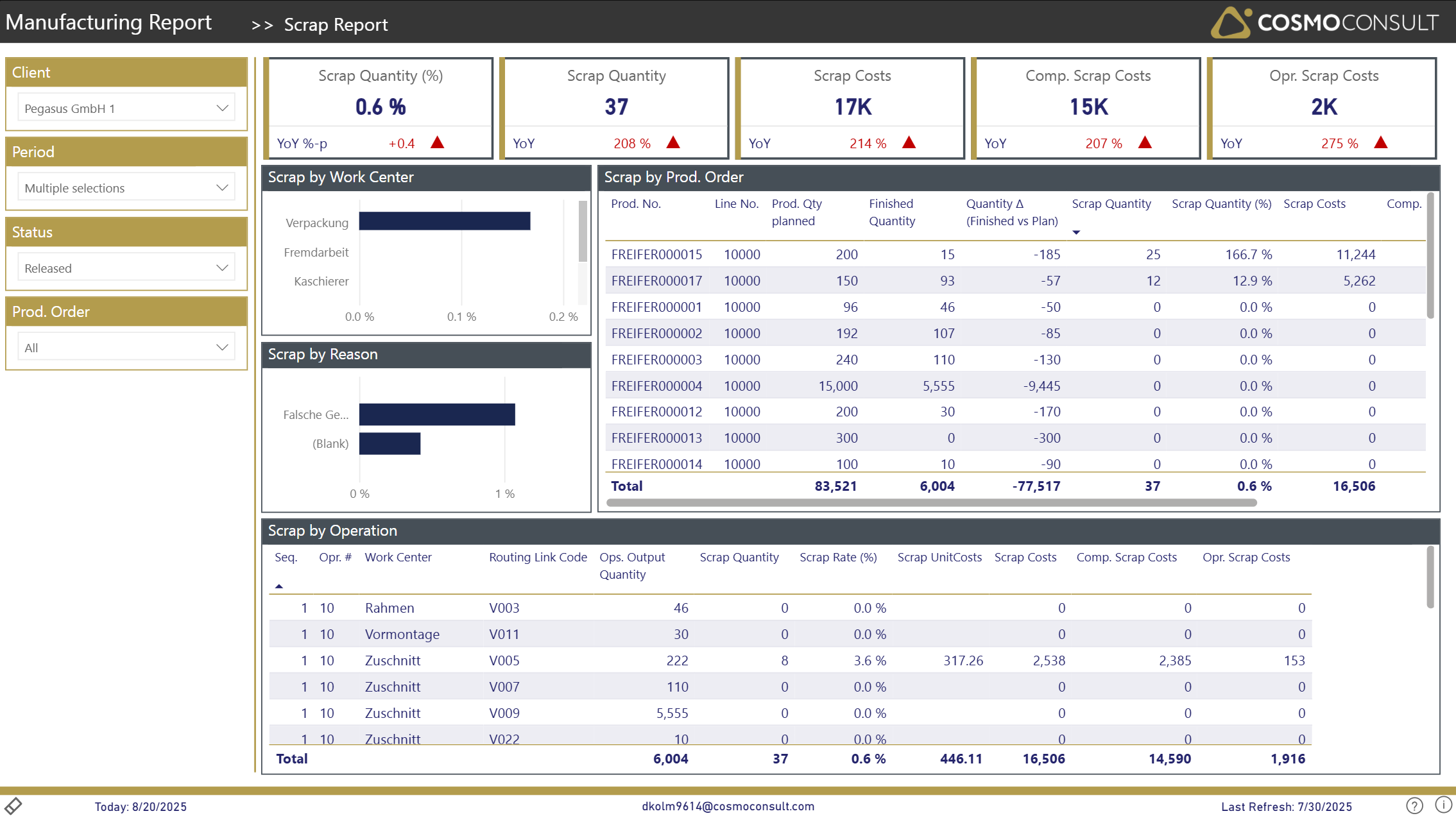 Scrap Unit Costs increases by tasks, as each task adds value to the product. All details can be analyzed using interactive filtering to identify main drivers.
