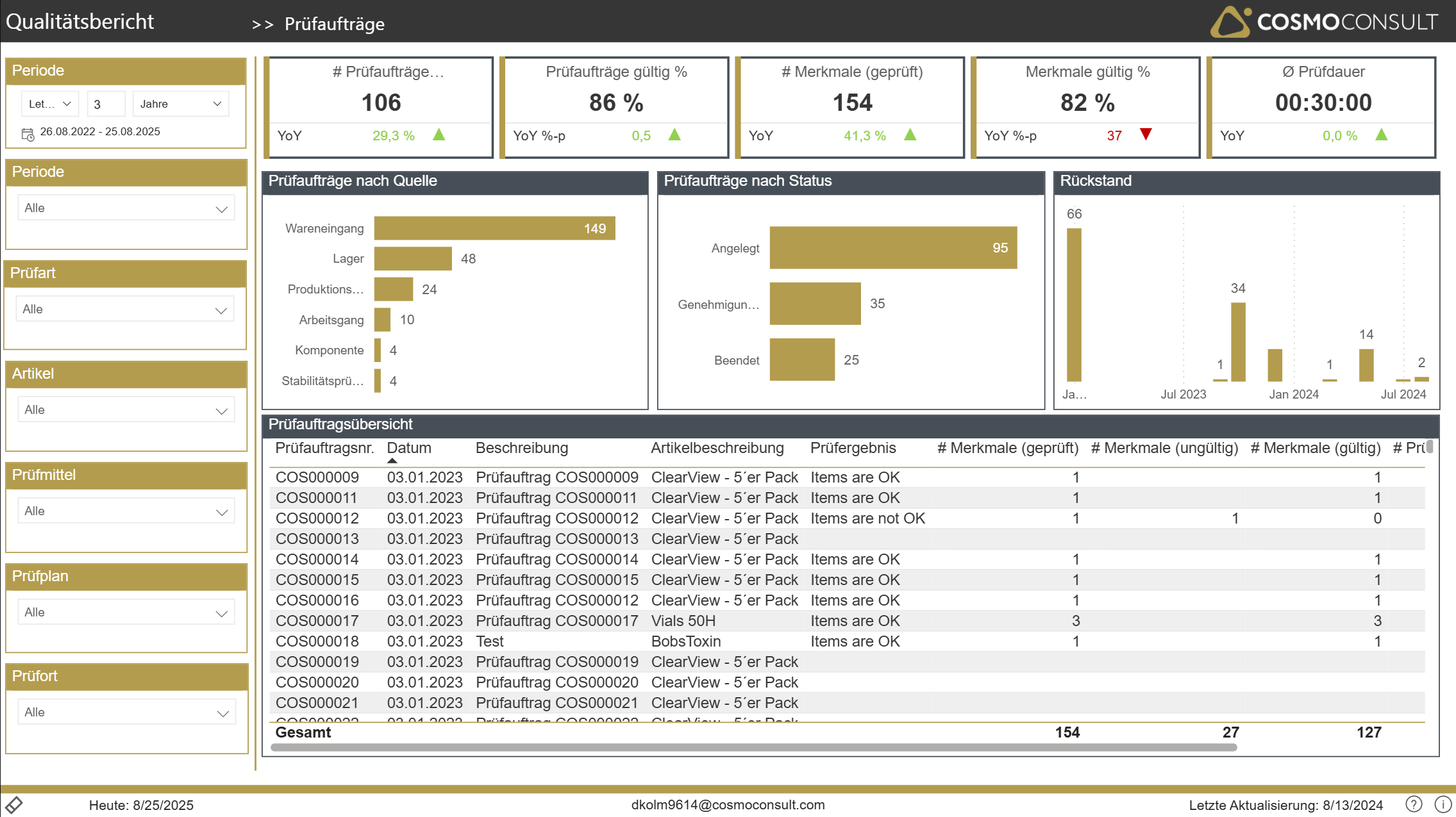 ...provide you with an aggregated overview of test-results by test-order. Identify properties tested and success-/error rate by test order. Use the bar-charts by source & status or any slicer to filter the details table and get an overview about your backlog in the upper-right chart.