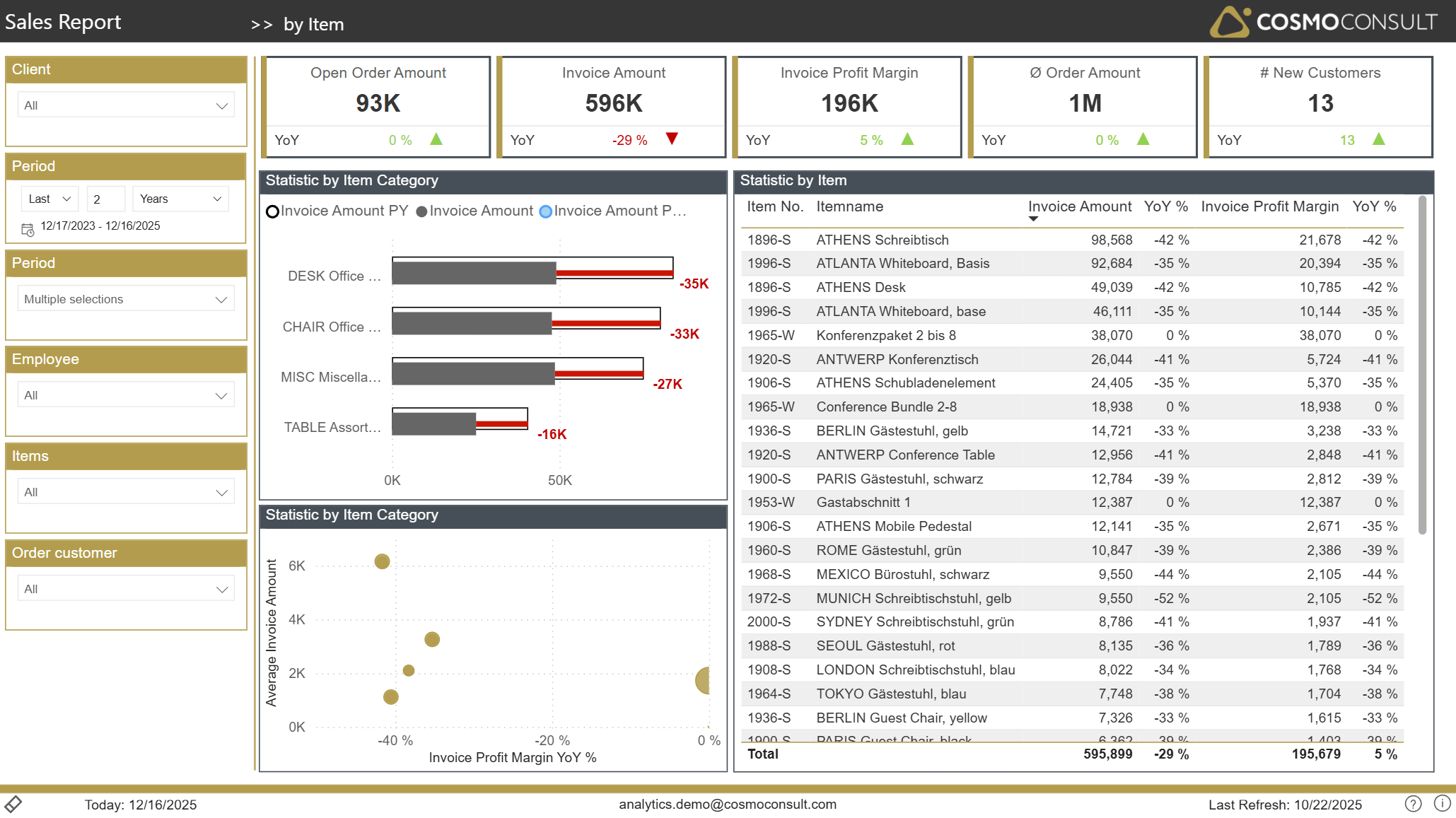 The same global filters as on the Overview page are available (Client, Period, Employee, Items, Order Customer). In an item context they allow you to: