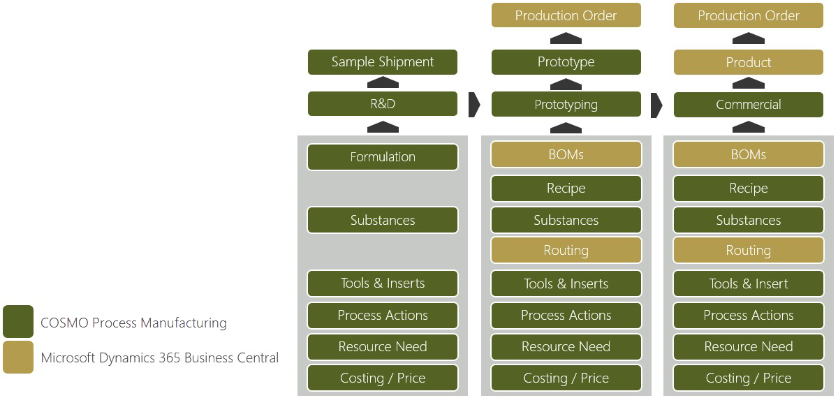 The following graphic contains three levels of scale. Development-scale batches are those that are made when a recipe is still being tested in the lab. Laboratory structure is used for pilot-scale, which may be for the purpose of learning how to manufacturing a product based on this recipe. When the BOMs/Routing is finalized then it moves to commercial scale.