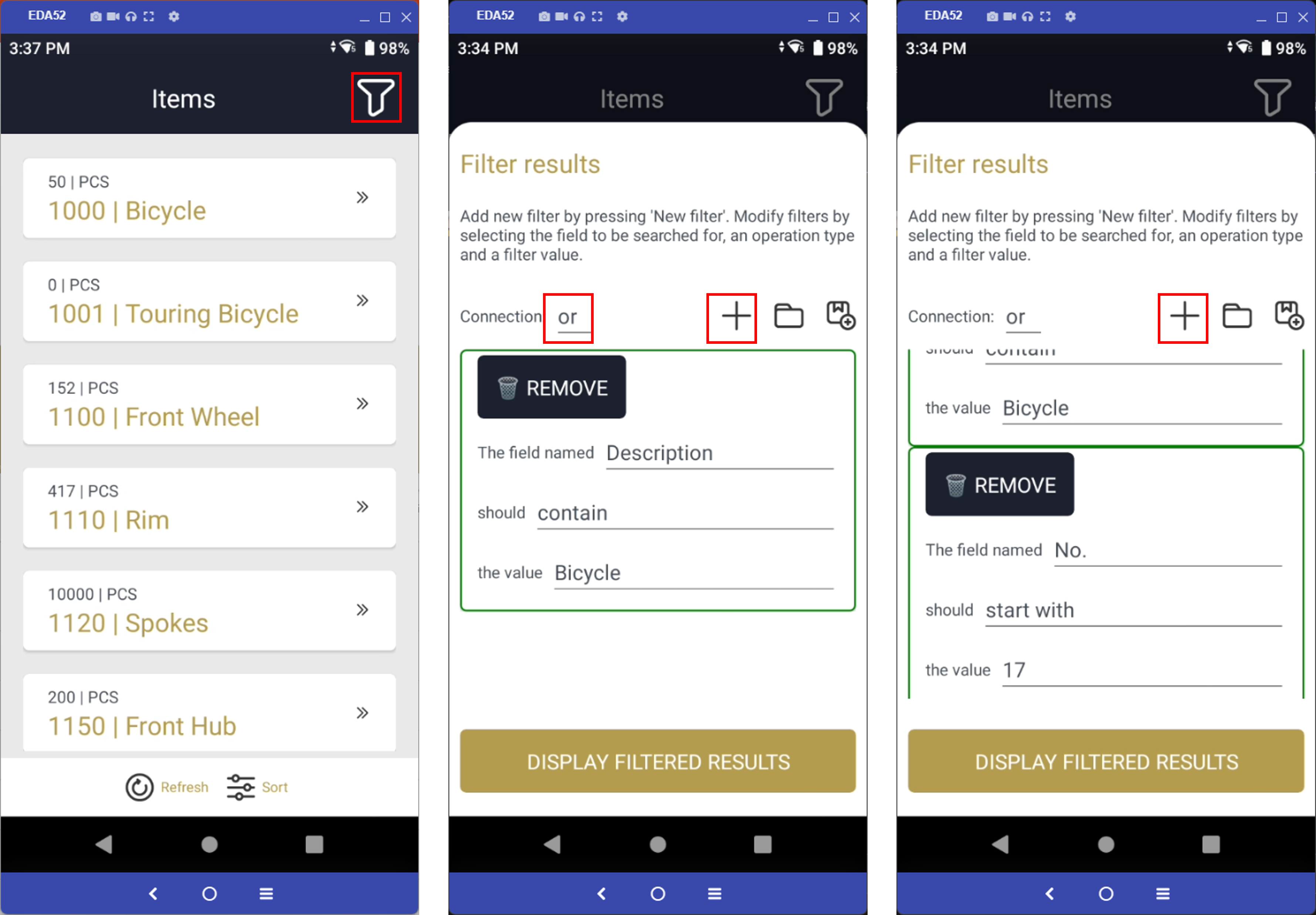 - Choose the + button and enter the filter criteria for the Description. If the condition is not needed, choose the REMOVE button.