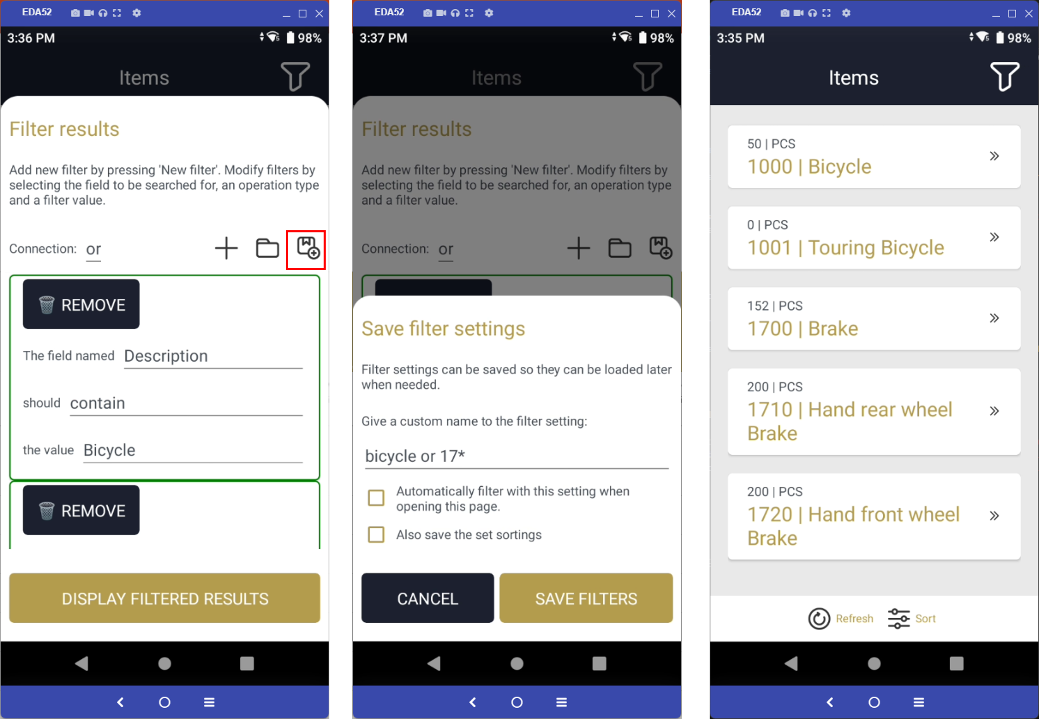 Display items with 'Bicycle' in the Description or Item No. starting with '17'. Since this is a frequently used filter condition, it should be saved for quicker application in the future.