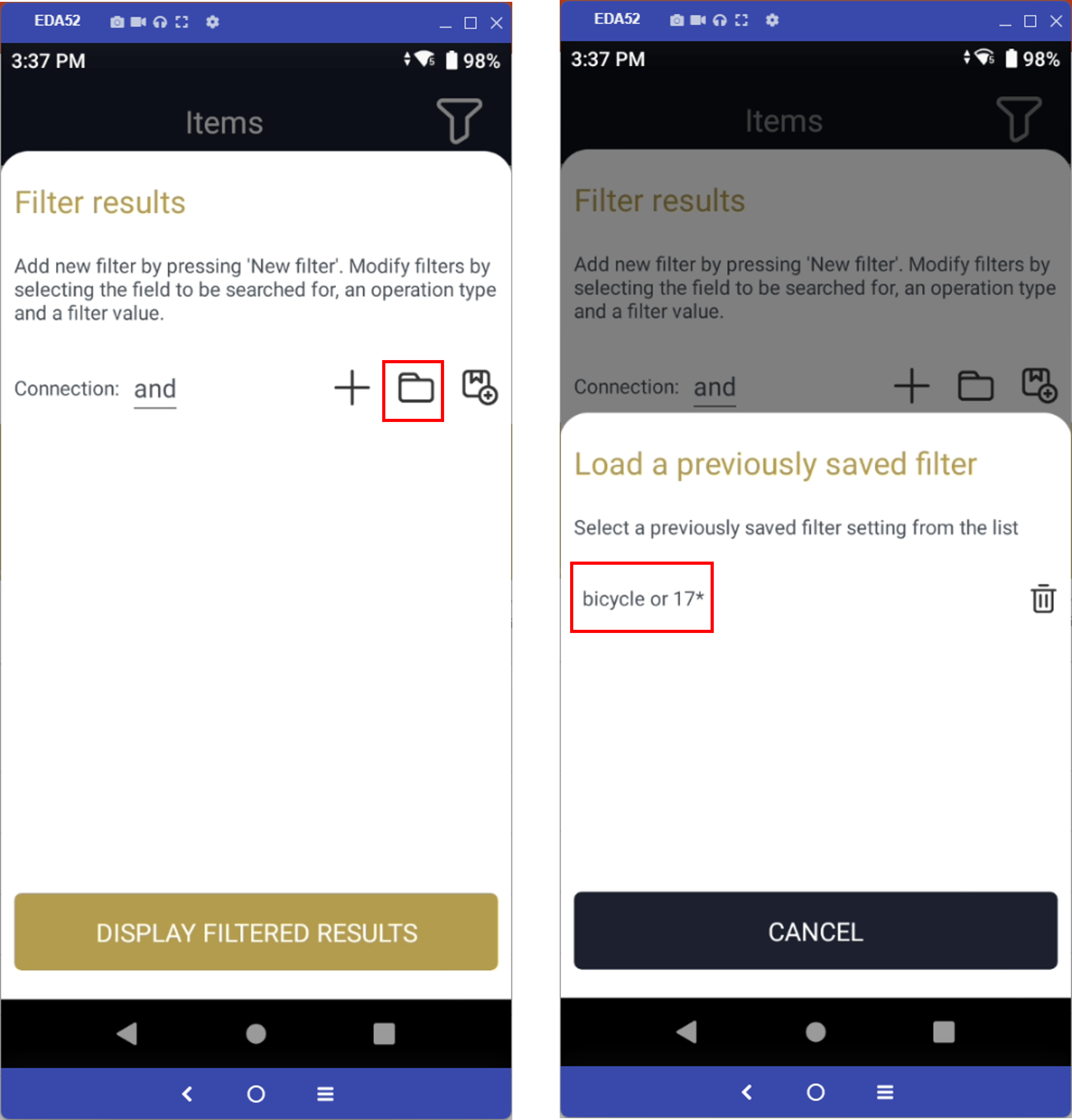 Saved filters can be reused by choosing the Folder icon and then choosing the filter name. Filters can also be deleted from this page.