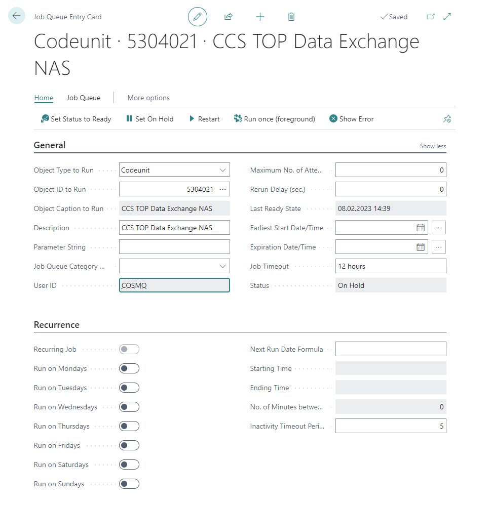 | Object ID to Run | The ID 5304021 ("CCS TOP Data Exchange NAS") must be entered here. |