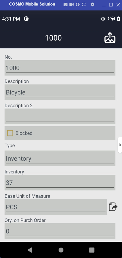 As illustrated below, the card view on the left shows various item-related fields for the Bicycle (item number, description, inventory on hand, UOM, etc.). The list view on the right shows all items, which includes a quick view of the inventory on hand, UOM, item number, and description for each item. These settings, as well as the Refresh and Sort buttons at the bottom, are defined in the List View FastTab.