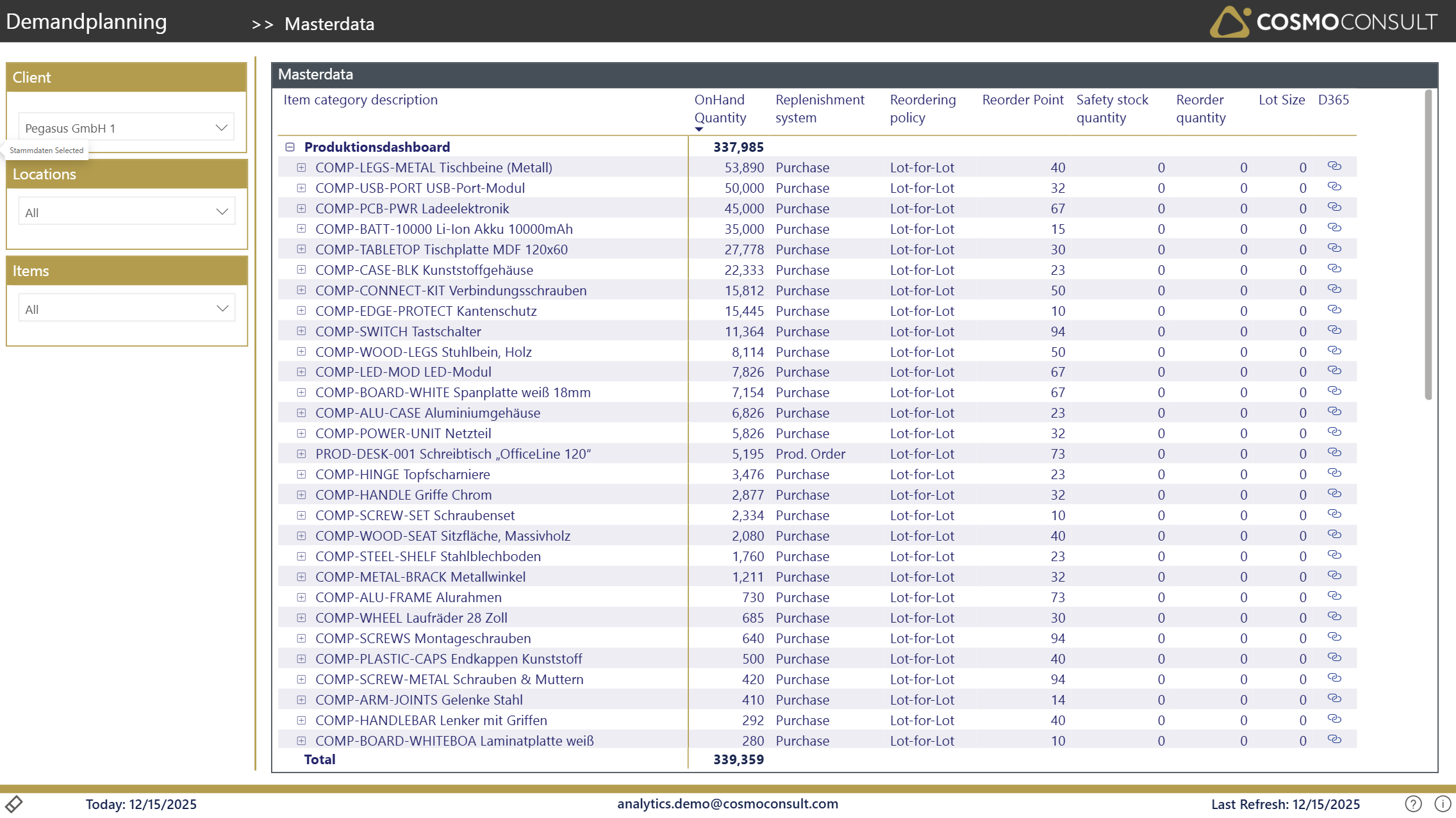The Master Data page displays all current replenishment parameters for items and locations (SKUs), providing a comprehensive overview for maintaining and validating inventory control settings.