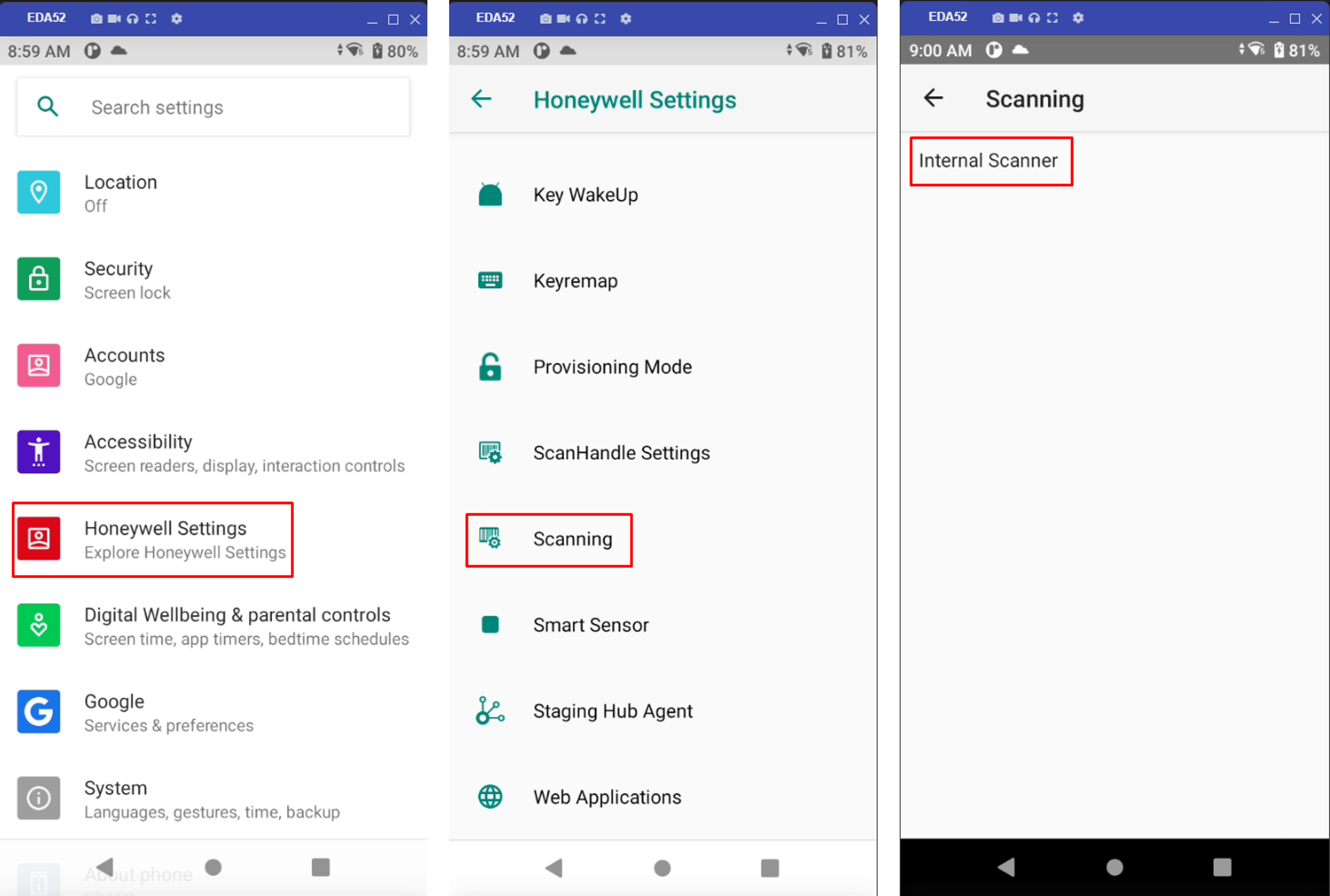 1. Choose Honeywell Settings in the device settings. In the Honeywell Settings list, choose Scanning and then choose Internal Scanner in the Scanning list.