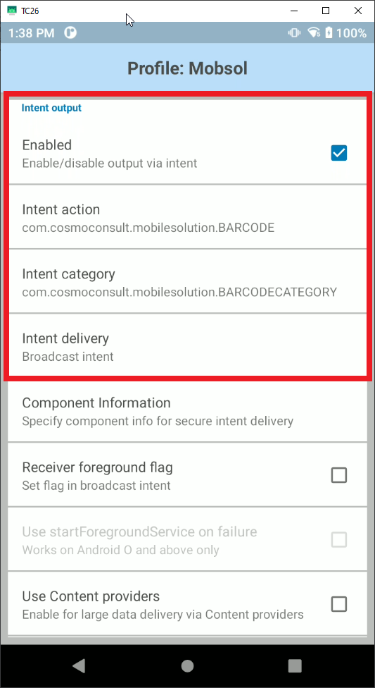 The Intent action must be set to com.cosmoconsult.mobilesolution.BARCODE, and the Intent category (leave empty if you left it empty in Business Central) set to com.cosmoconsult.mobilesolution.BARCODECATEGORY.