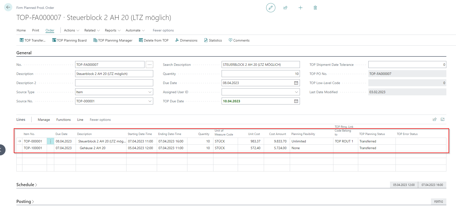 - Transfer of production orders to the external PPS including the complete production structure of Microsoft Dynamics 365 Business Central, as well as the retransfer of the planning results from the external PPS to Microsoft Dynamics 365 Business Central