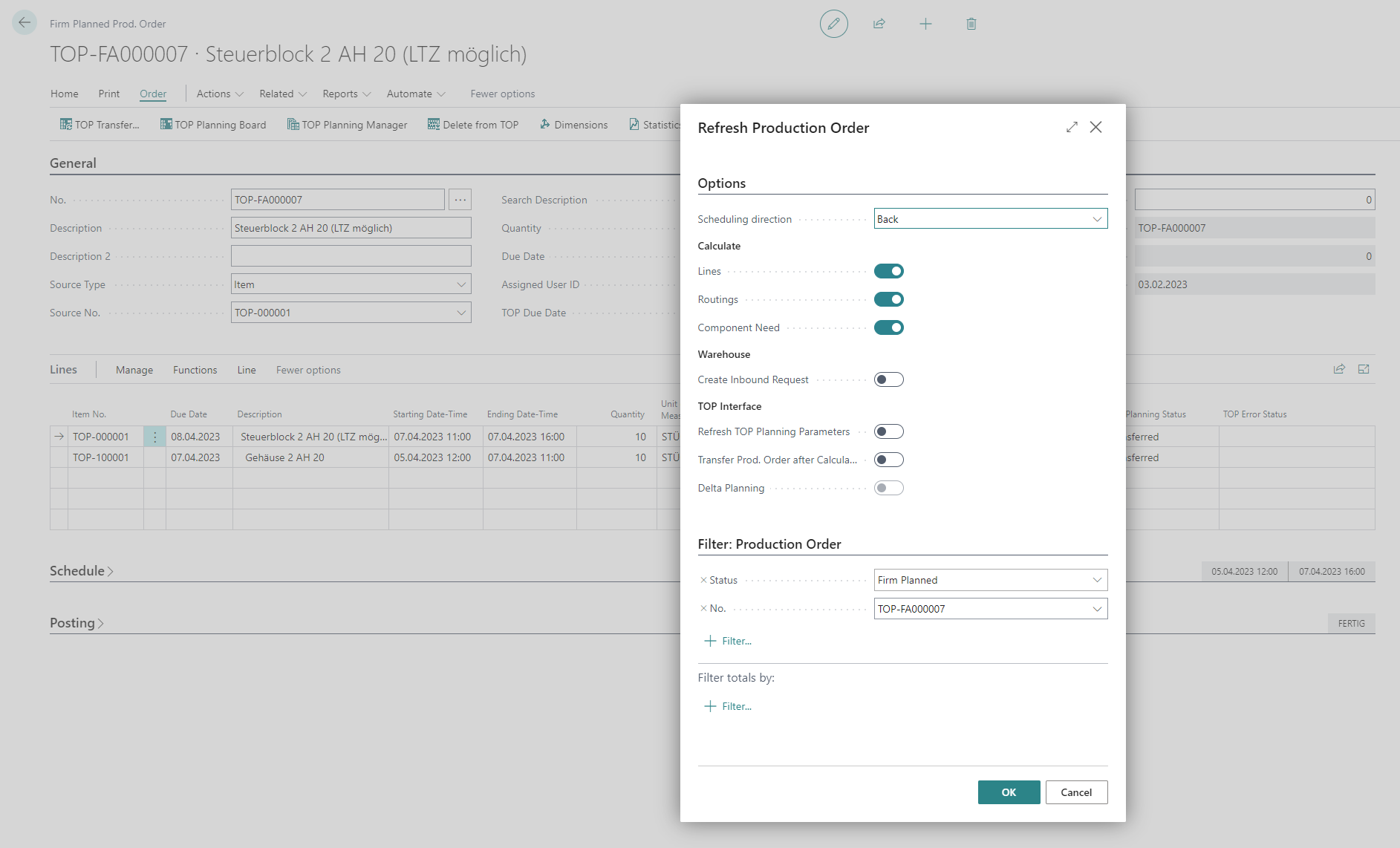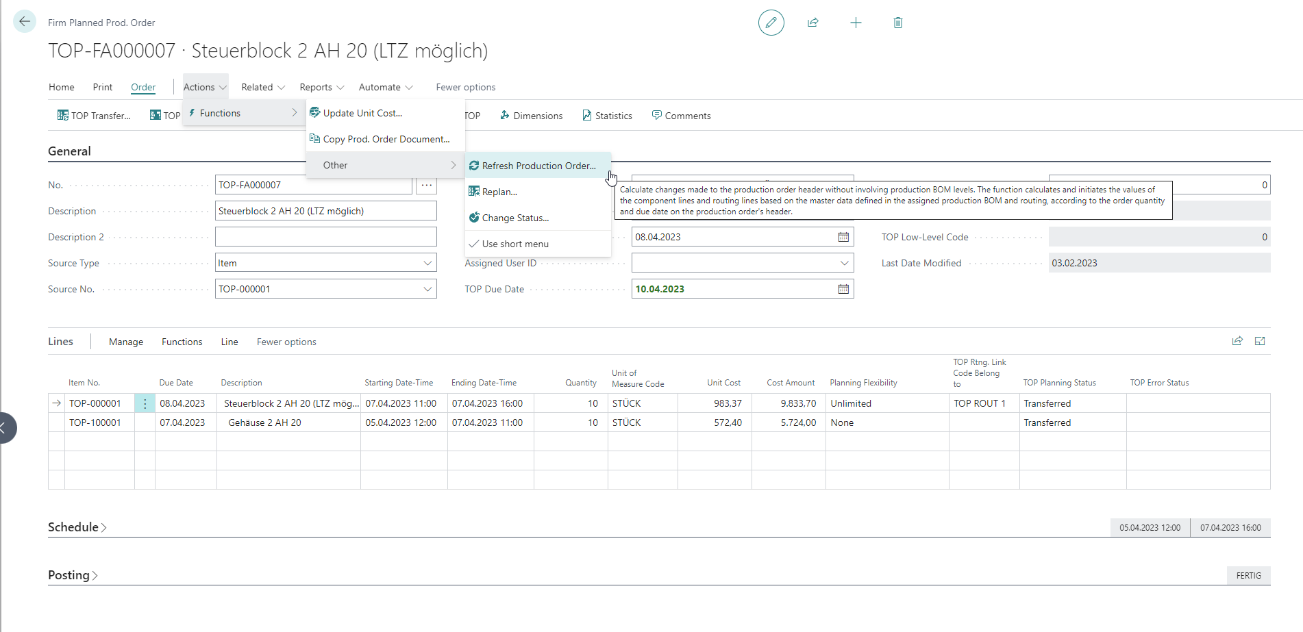 If a production order is updated manually, it will also be transferred to the external PPS immediately after the calculation, depending on the setting in the TOP setup. For this purpose, there is a corresponding option in the report for refreshing the production order, which can already be preset by the corresponding setting in the TOP Setup. Furthermore, there is an option to refresh the TOP planning parameters while refreshing the production order. This means that the actual settings of the planning parameters from the corresponding work centers will be transferred to the respective routing lines.