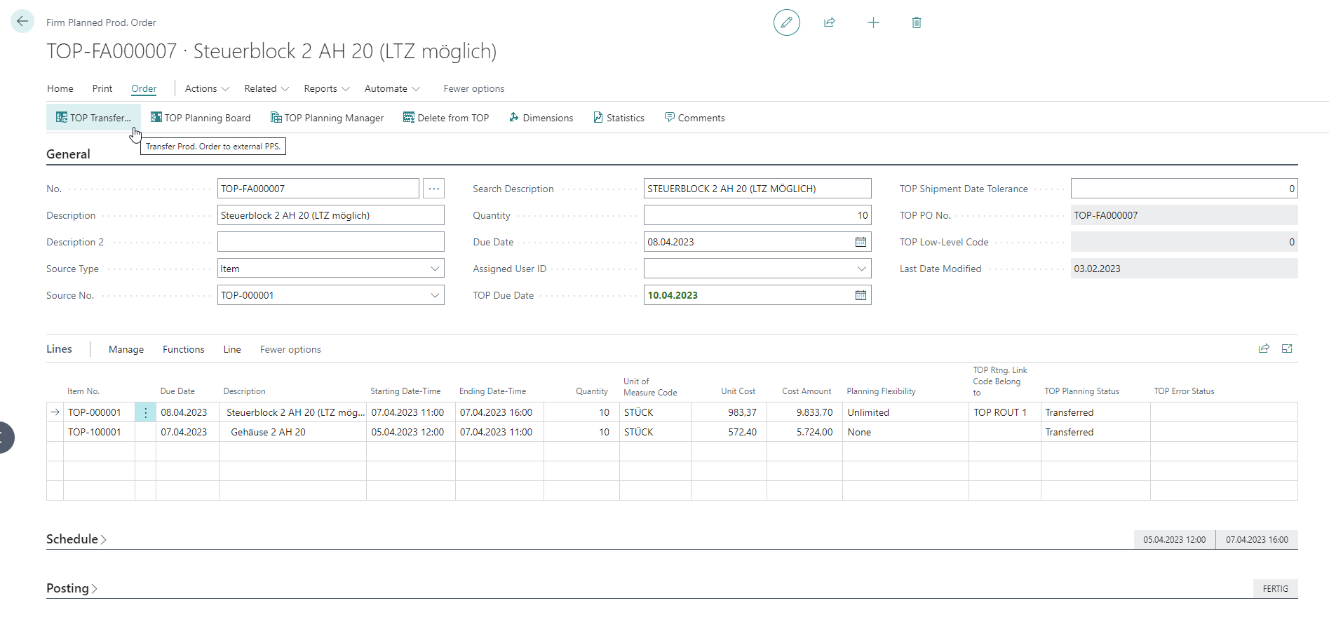 The transfer of production orders from Microsoft Dynamics 365 Business Central to the external PPS is usually done manually, i.e. the user decides which production orders should be planned in the external PPS, and transfers them with a simple push of a button. Similarly, after manual changes to a production order, it must be transferred again if these changes are relevant for planning.