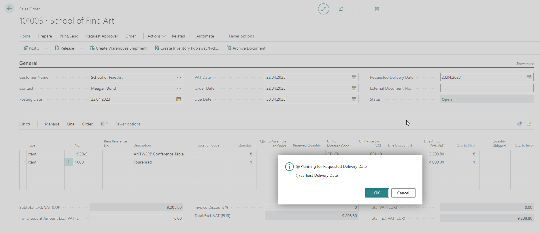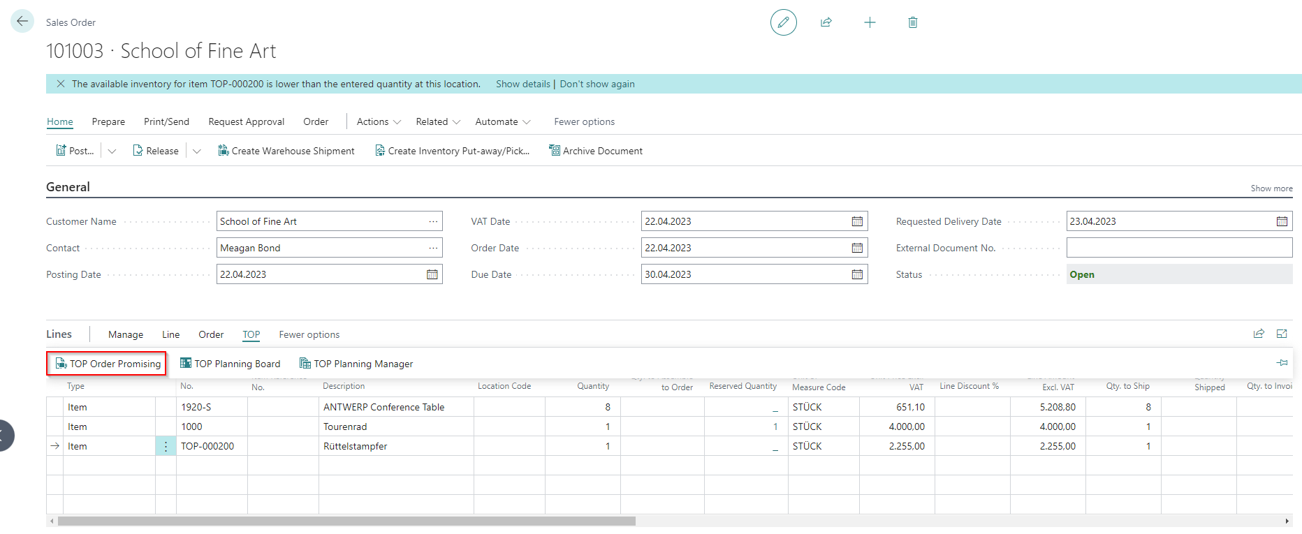 In the background, a production order (TOP PO No. on the line) with the target data is generated and transferred to the PPS, from which either the desired delivery date can be confirmed or the earliest delivery date is calculated as the result. The determined date is displayed in the TOP Finishing Date field in the order/quotation line. The status of the production order created in this way can be defined automatically in the TOP Interface under Prod. Order Status Sales Quote/Order.