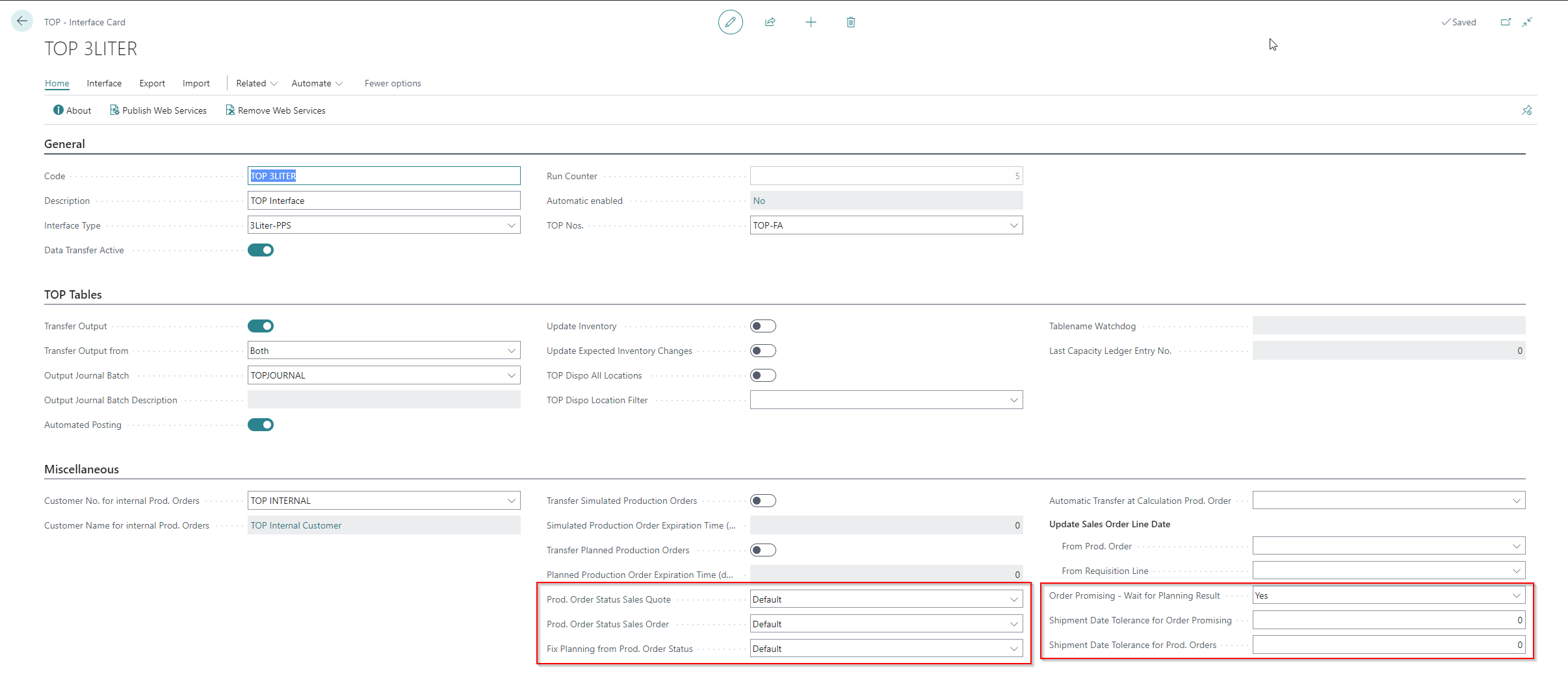 To use both functions, the TOP Interfaces setup must be maintained. Especially the fields highlighted in red (see TOP Interfaces).