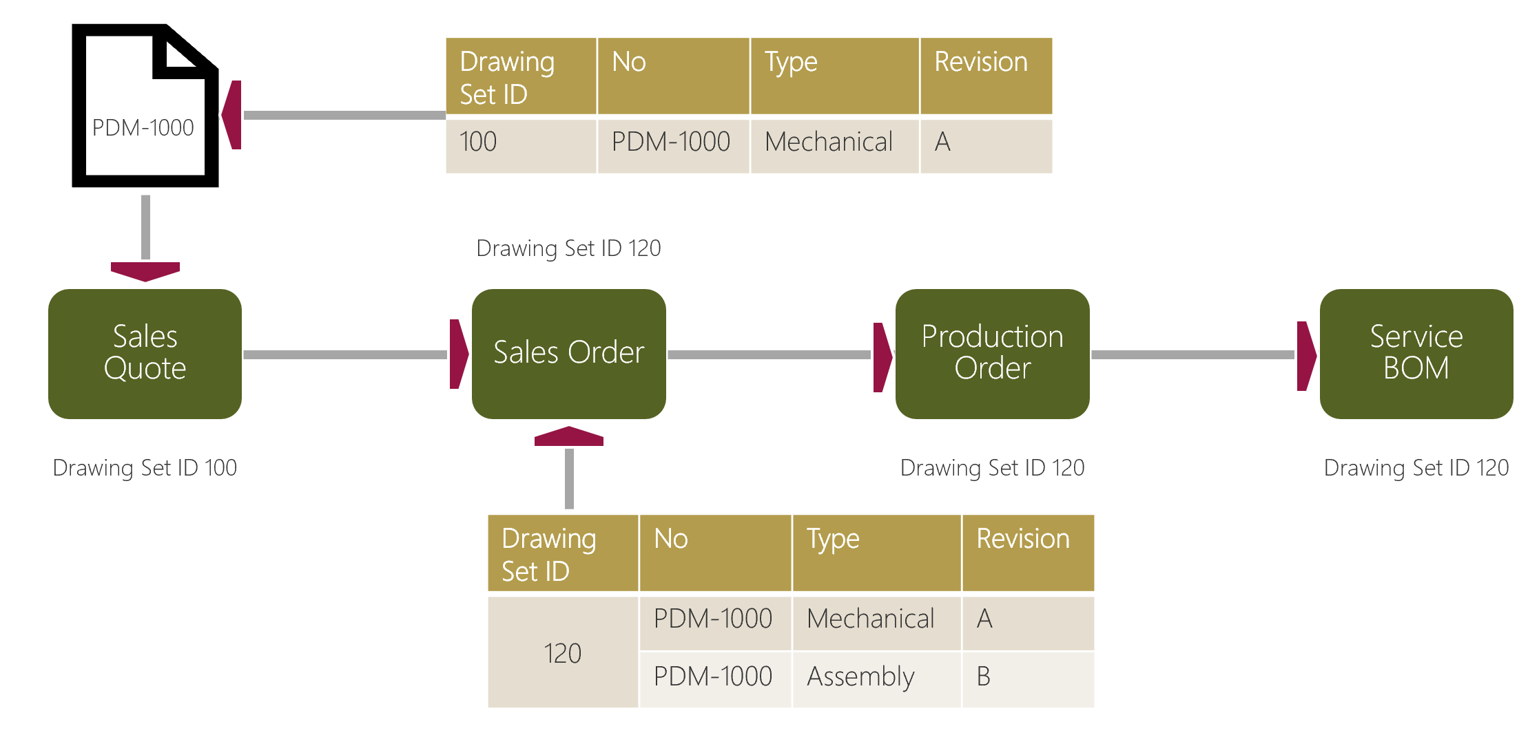 The mechanical drawing PDM-1000 in revision A is assigned to an item. This is the drawing set with the internal number 100. This drawing set number is passed on to the sales quote when the quotation is created and from there to the sales order. In the sales order, the assembly drawing PDM-1000, revision B is assigned. The new combination of both drawings corresponds to drawing set number 120, which is now inherited in all subsequent documents.