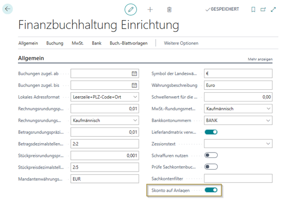 In der Finanzbuchhaltung kann über einen Parameter definiert werden, ob der Skonto auf Anlagen verwendet wird oder nicht