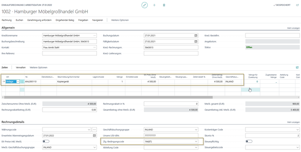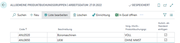 Für jedes Anlagenkonto, auf welchem mit Skonto gebucht wird, muss eine eigene Produktbuchungsgruppe angelegt und auf dem Sachkonto hinterlegt werden.