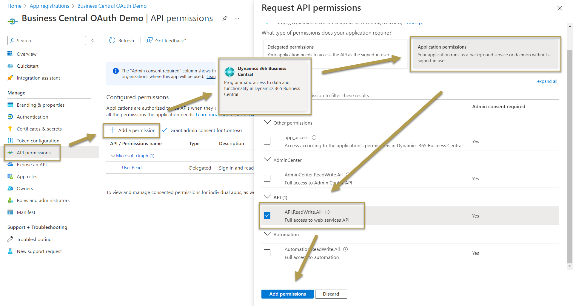 2. For Service to Service (S2S) authentication, create application permissions for Dynamics 365 Business Central and check API.ReadWrite.All. You may also use delegated permissions and check user_impersonation and Financial.ReadWrite.All, if a specific user is used for authentication.