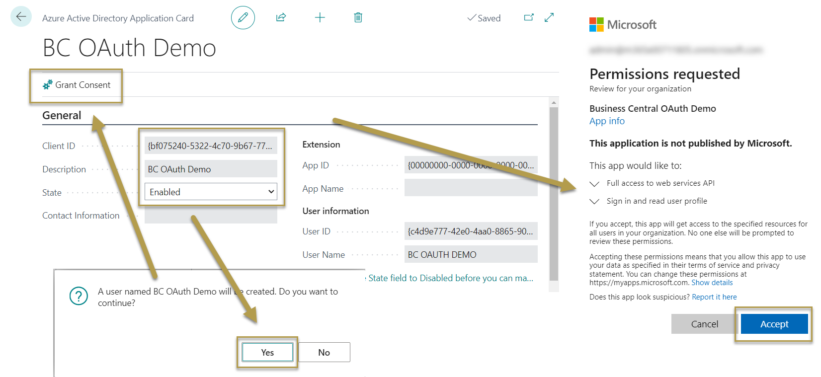 2. Enter the client ID from the steps before and a description. The description will be used as User Name. Select State = Enabled and confirm the dialog. Then choose Grant Consent and accept the next dialog. If the Azure app has not already been granted consent in the Azure portal, an additional dialog might appear. The Azure application is now represented by a new user inside Business Central.