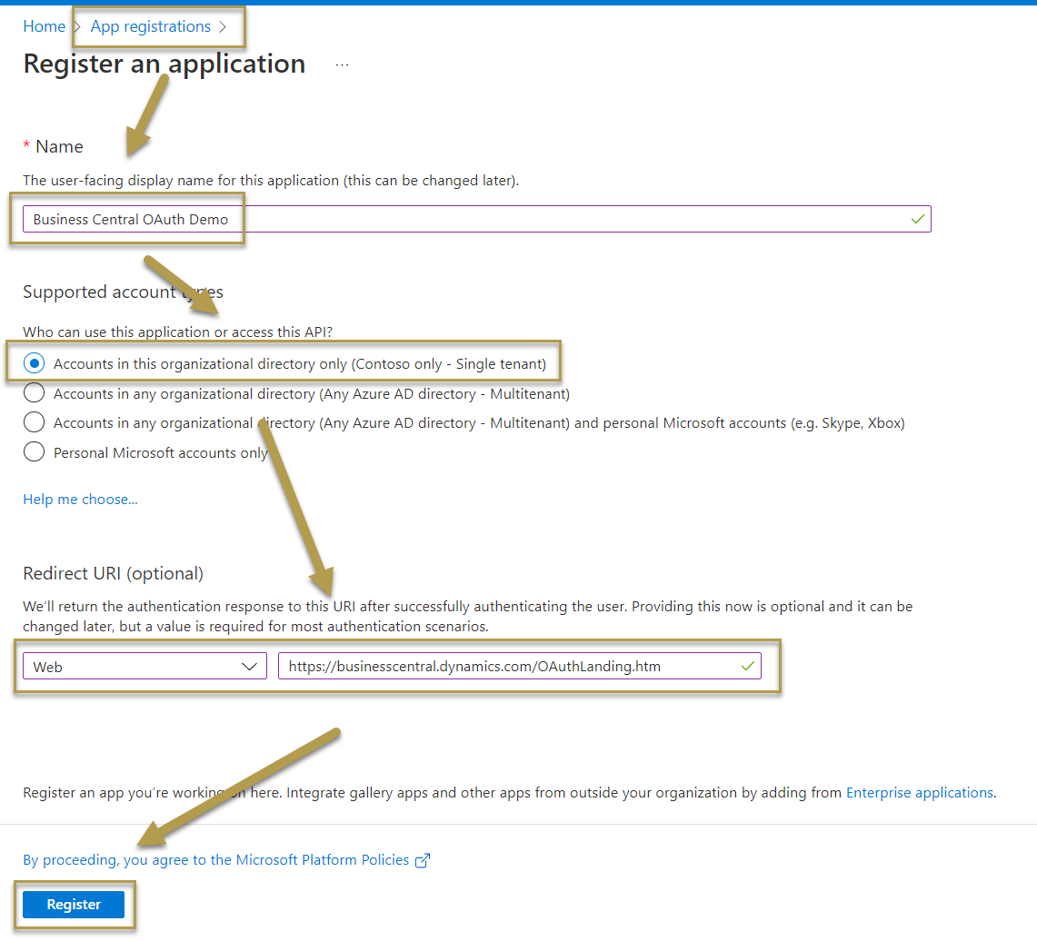 1. Register an app in Azure portal. For connecting to Business Central, add the endpoint OAuthLanding.htm (for example, https://businesscentral.dynamics.com/[<environment id>/]OAuthLanding.htm). You might set the account type to Multitenant, if the app is shared across different Azure tenants.