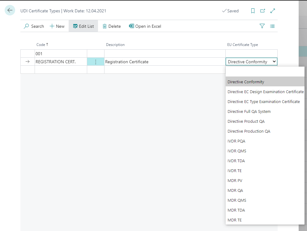 | EU Certificate Type | Specifies the certificate type that will be used when exporting to EUDAMED. |